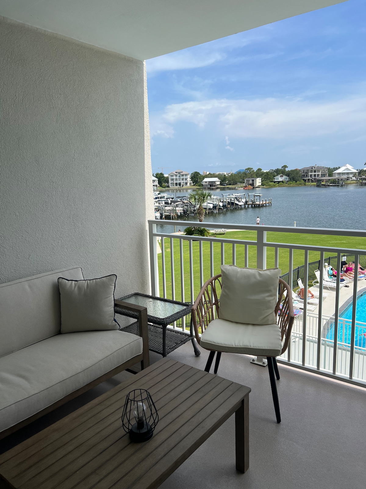 Relájate con toda la familia, tus amigos, en la playa o junto a la piscina en la bahía de esta tranquila propiedad frente al mar. Observa los barcos desde el balcón o trae tu propio barco y remolque, los amarres aquí son por orden de llegada. La isla de Robinson AL (en el paso de Perdido) y la isla de Johnson (lado de Pensacola) están a poca distancia en barco. Pescar desde el muelle, hacer surf de remo/kayak y pescar cangrejos son opciones divertidas.