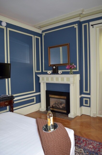 Sleep in a private room wrapped in roses, on a queen size brass bed, and dream of romantic gardens. When you awake, prepare for your day at the white wicker vanity, or sit in one of the armchairs (not pictured) next to the electric fireplace and delight in the essence of summer. A private large bathroom with a large walk-in shower and wall mounted heater for your personal comfort completes the scene. Living Room & Dining Room spaces are common areas in this 5500 sq ft mansion.