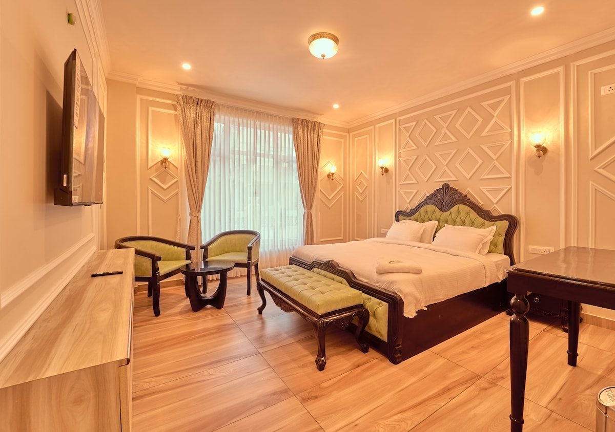 La habitación Cowboy Non View ofrece una estancia perfecta para familias pequeñas o parejas. Situada en la planta baja en una de nuestras 6 amplias villas, esta habitación tiene más de 120 pies cuadrados y cuenta con comodidades modernas como TV, géiser y secador de pelo. La habitación tiene capacidad para 2 adultos + 1 niño y tiene una entrada independiente para mayor privacidad, no conectada a la sala de estar común de la villa.