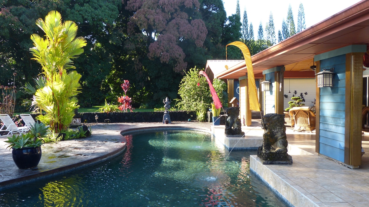 ¡ALOOOHA! ¡Ven! Pasa el tiempo en la casa sin salas donde estás al aire libre al salir de tu suite tropical. Duerme con la mágica melena del surf; ve cautivadoras puestas de sol; relájate en la bañera de hidromasaje y maravíllate con la Vía Láctea. Nuestro cautivador volcán vuelve a entrar en erupción en el campo. Experimenta su esplendor. Camina por sus selvas tropicales. Nada con tortugas. Explora nuestras hermosas nuevas playas de arena negra a pocos minutos y disfruta de todo lo que The Big Island tiene que ofrecer. ¡No se requieren tareas domésticas!