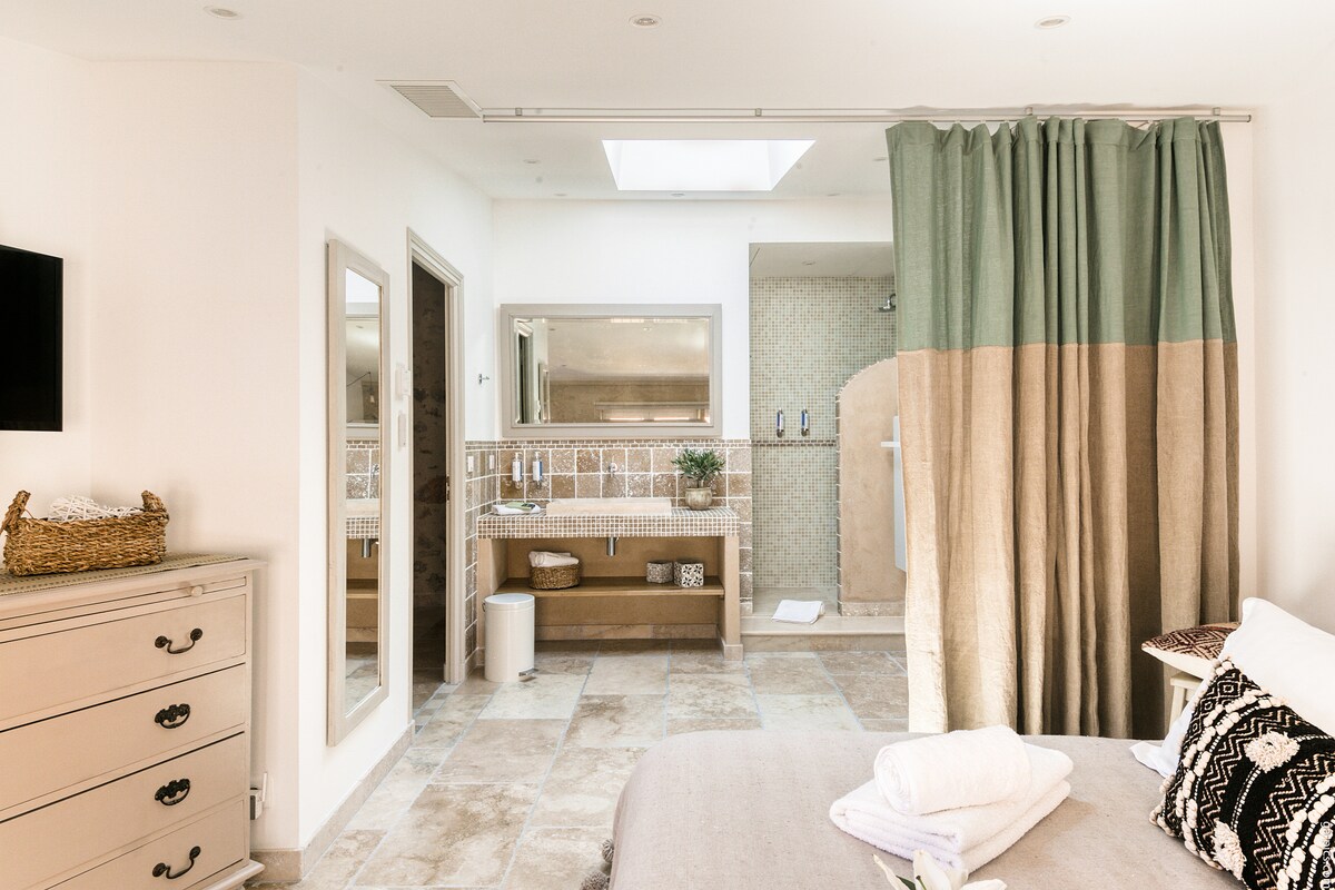 Hermoso estudio para 2 personas con un enorme baño y su propio jacuzzi, perfecto para parejas. Ubicado en un alojamiento espacioso rodeado de 10 000 metros cuadrados de propiedad aislada con animales exóticos, lama, burros, swanns disfrutando de un minilake. Piscina infinita de 10 x 10 metros. Campo de golf a poca distancia, a 4 minutos en coche de las tiendas, a 5 minutos del pueblo medieval de Valbonne, a 25 minutos de Cannes y Niza. Tenga en cuenta que no organizamos eventos como fiestas de aniversario, bodas, etc.