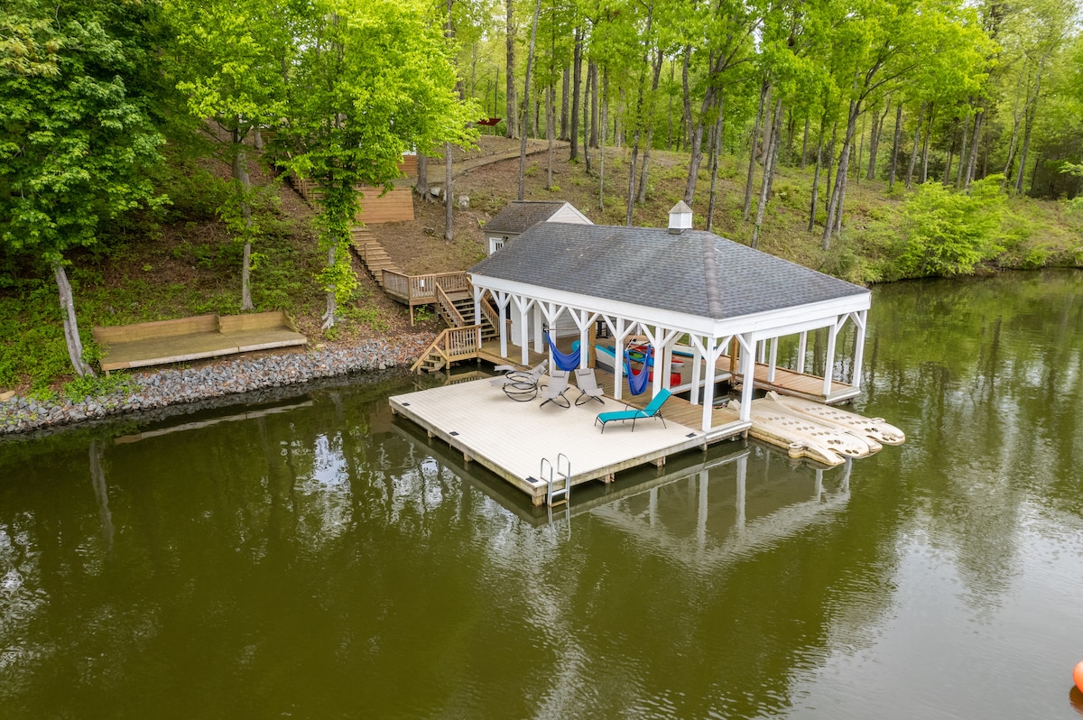 This 7 bed 5 bath 6,000+ square foot Waterfront home is great for large families, wedding parties, groups of friends, and fur babies! A rustic, farmhouse chic home with tons of natural light and cozy nooks. Comfy, large living room sectional, roku TVs, huge swimming dock and ample water frontage. Plenty of privacy and tons of serenity!