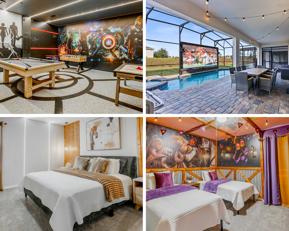 El equilibrio perfecto entre DISEÑO CON ESTILO, CONFORT DE LUJO y ENTRETENIMIENTO SIN FIN en el impresionante Reunion Resort de 3,5 millas cuadradas. Tendrás tu propia piscina privada, spa, sala de cine y juegos, 3 suites principales, 3 increíbles dormitorios temáticos (MARVEL, FROZEN II, NASA) para niños o adultos, la última estación de juegos Xbox Series X, una terraza de piscina de 2500 pies cuadrados con vistas a un hermoso bosque y estanque, chimenea y mesa de billar, a pocos minutos de Disney.