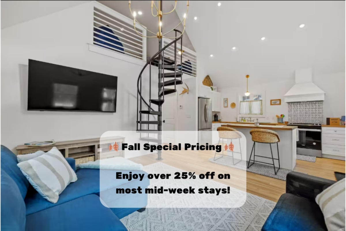 Both rustic and elegant, the Birch Ledge Guest House offers a cozy place to relax and recharge, whatever the season. The first floor features a spacious living room (with queen sized pull-out-couch), dining area, and small kitchen. The bathroom has a walk-in shower. The second floor is a loft accessible by a spiral staircase and has a comfy queen and two twin sized beds. The guesthouse is surrounded by quiet forest and is an easy 30 minute drive to Portland.