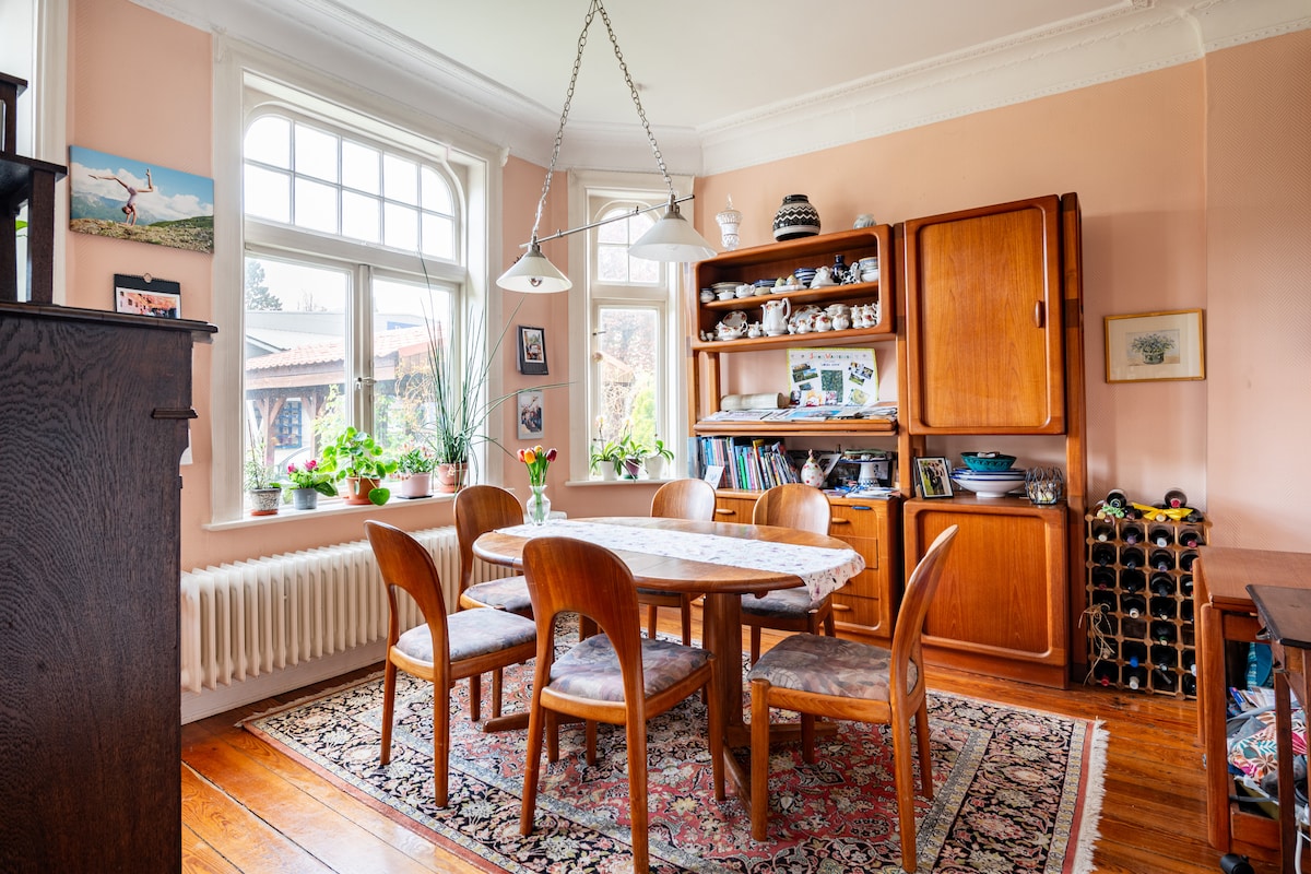 Nuestra hermosa casa oficial es la antigua residencia del duque de Oldenburg y está ubicada en la parte trasera de nuestra finca, rodeada de vegetación con vistas a campos y prados. Las habitaciones son amplias y están diseñadas con buen gusto e incluso con muchas personas siempre puedes encontrar tu propio refugio para respirar. Un enorme jardín privado con terraza y muebles de jardín te espera, junto a él es nuestro prado de caballos.