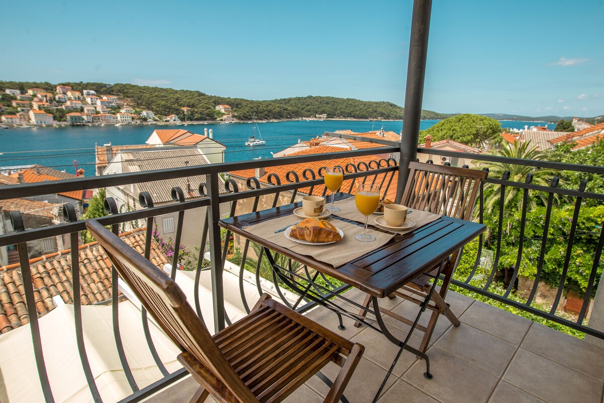 Hermoso apartamento nuevo cerca del mar y la playa con vistas al mar. Tiene un gran jardín con vistas al mar donde puedes relajarse. Nuestro departamento está situado en una ciudad histórica de Osor.