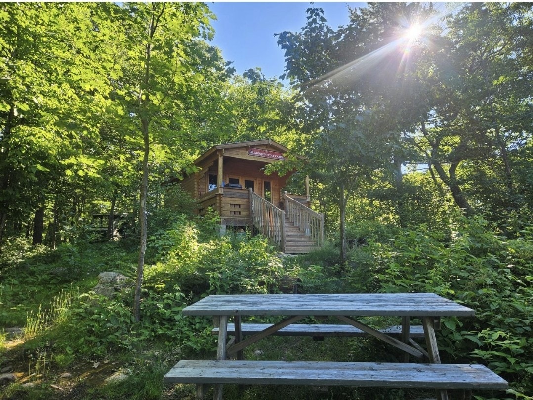 🌳La cabaña del lobo algonquino Tu cabaña solar aislada en una escarpa con impresionantes vistas al lago dorado. Colores otoñales, vida silvestre, piragüismo, rutas de senderismo, chimenea acogedora, fogata a la luz de las estrellas y transporte gratuito o acceso a pie: una escapada romántica perfecta para parejas (y mascotas) que aman la naturaleza y la privacidad. ♡