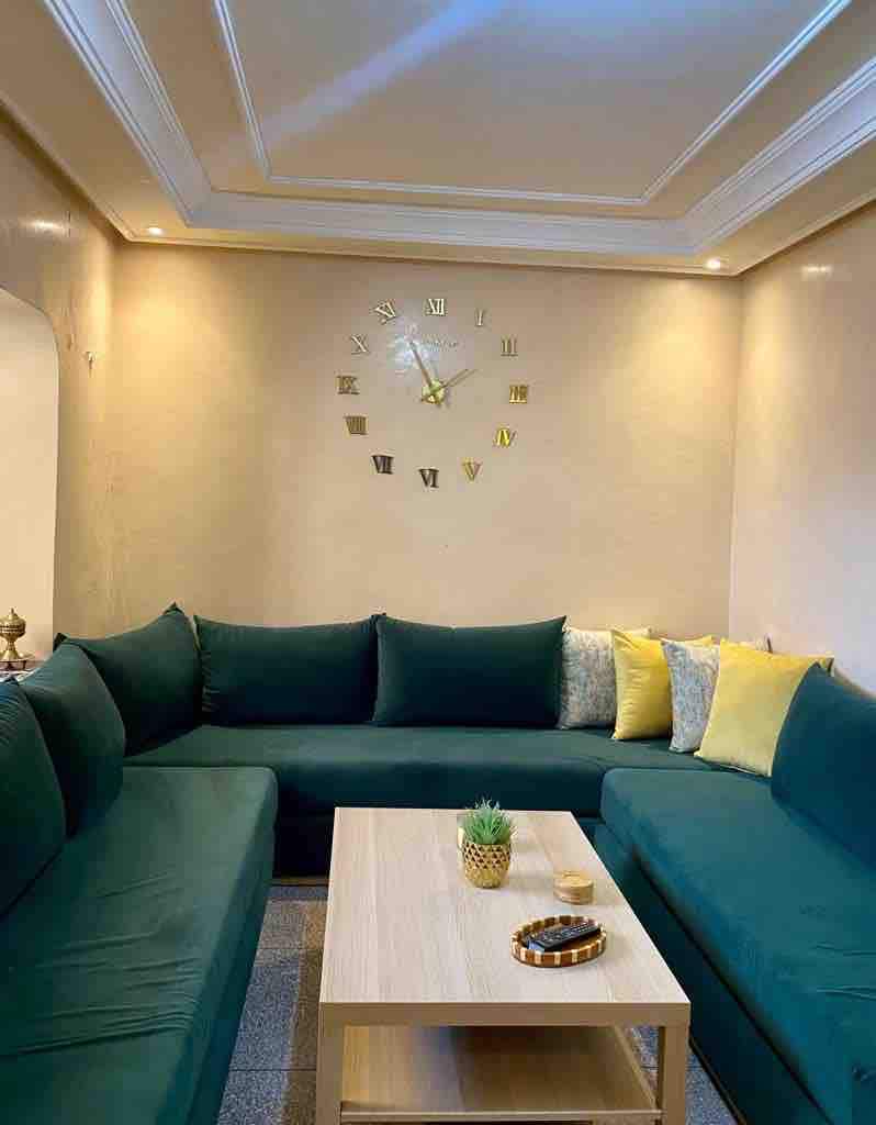Pongo a su disposición un lujoso apartamento de 150 m2 en una zona tranquila en el centro de la ciudad safi zona villa abierto a una hermosa vista de una hermosa terraza que contiene una fuente tradicional rodeada de macetas con una mesa de comedor decorada con zalij marroquí para pasar un buen rato y disfrutar del sol contiene 2 dormitorios,una sala de estar muy moderna,cocina bien equipada (cafetera,cocina, etc.) conexión wifi y un televisor de 65 pulgadas