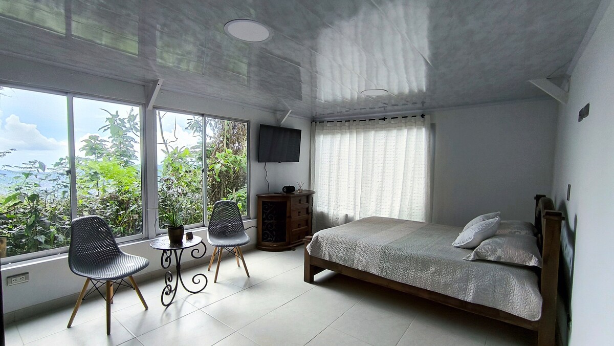 Disfruta de una escapada inolvidable en nuestro acogedor apartamento ubicado en la Vereda Buena Vista. Rodeado de naturaleza y el canto de las aves, este espacio es perfecto para relajarte y recargar energías. Nuestra casa cuenta con una habitación cómoda, baño privado, cocina equipada y una sala-comedor con vistas panorámicas a las montañas, al imponente Nevado del Ruiz y a Manizales ¿Estás listo para explorar la belleza natural de Manizales? El inicio perfecto para tus aventuras, que esperas!
