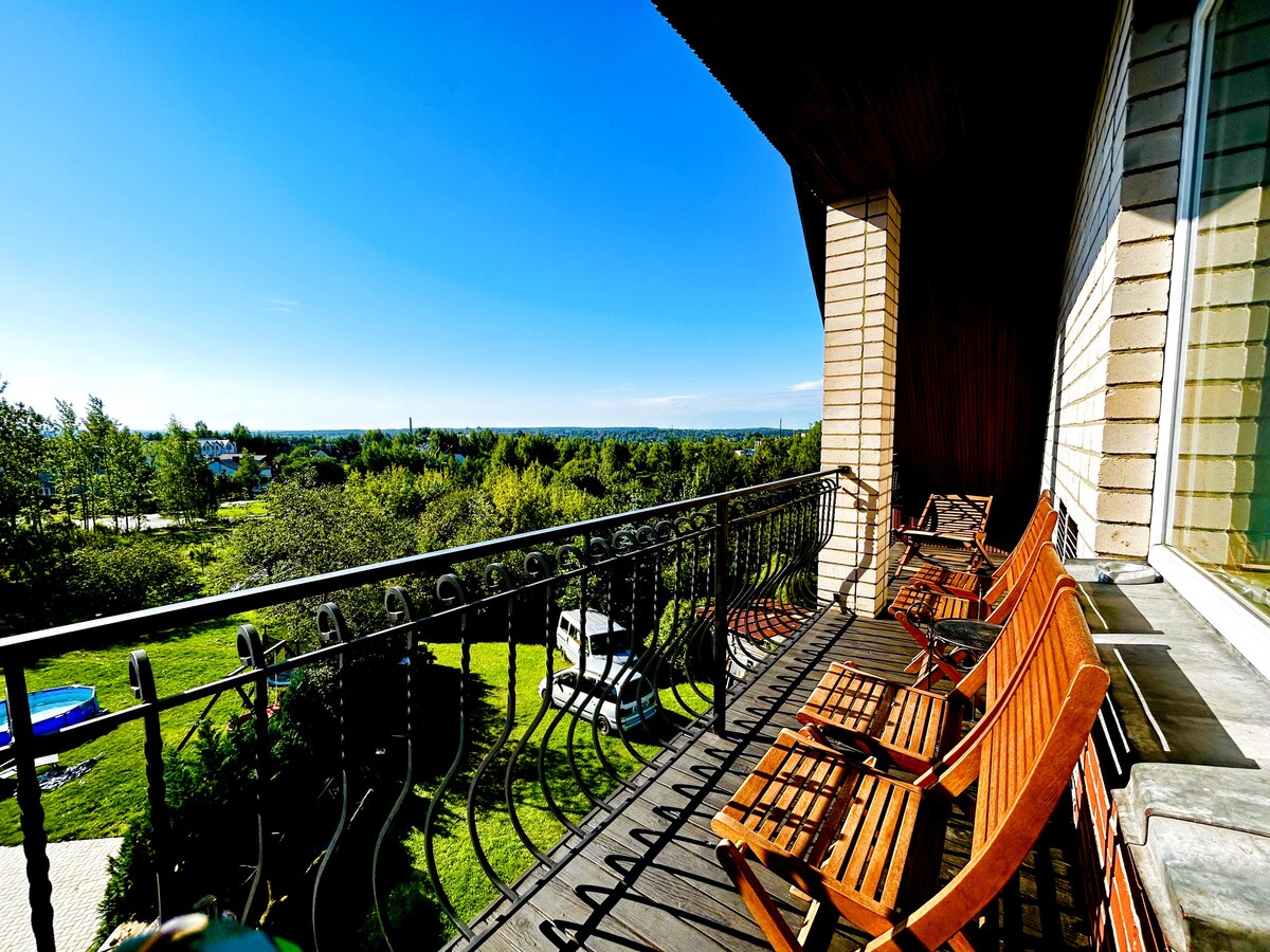 What you will love about this place: Historic rustic log house with big garden located inside newly built community with playground for children. Hill top location with far horizon views through all windows, fire place, heated floors, air conditioning, home office space. Easy access by paved road through monitored gates - parking in private territory. Only private housing nearby so very quiet. Easy access: no traffic jams - always 10 minutes through regional park forrest to the old town
