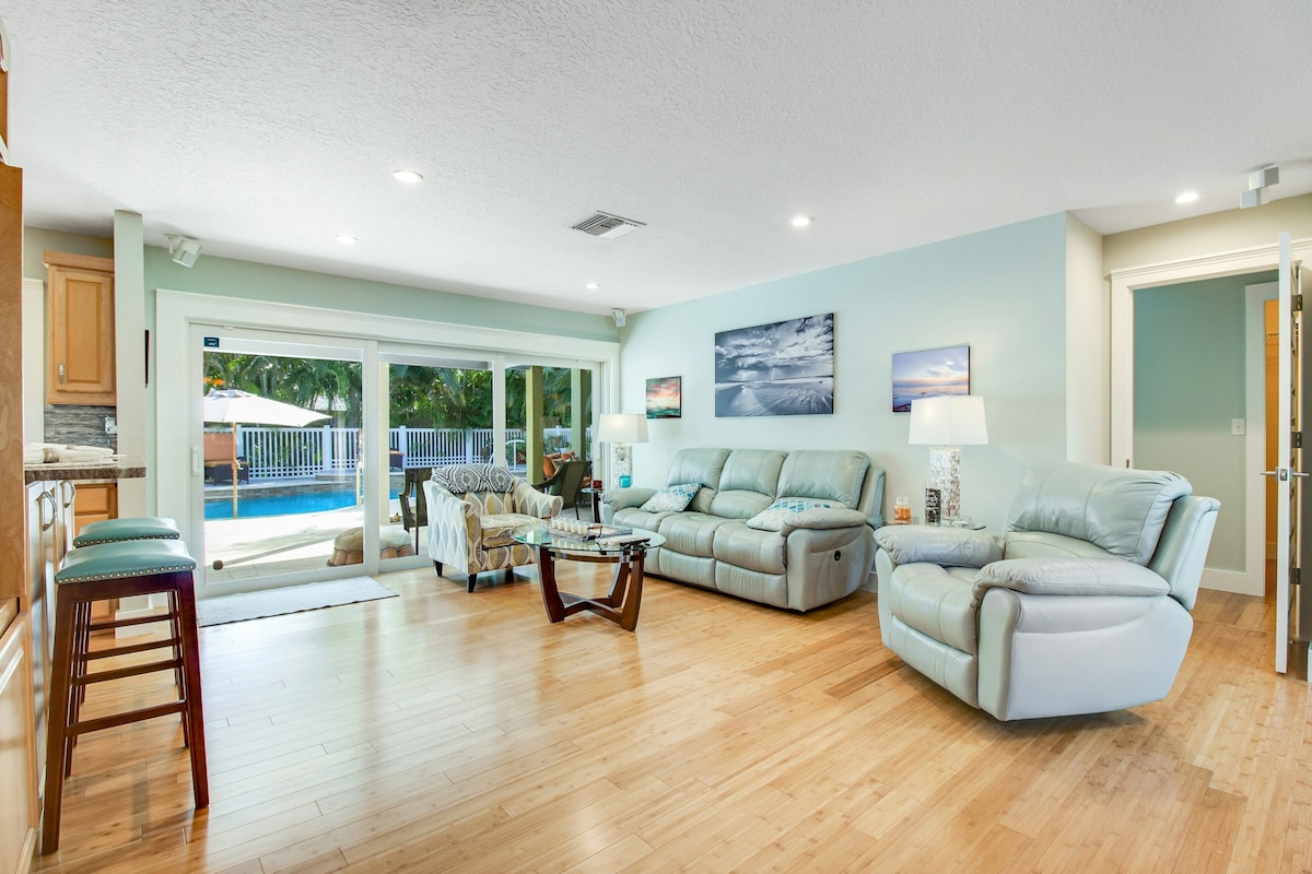 Bienvenido a Blue Palm, tu escapada de vacaciones para familias y mascotas en el corazón de Palma Sola. A pocos kilómetros de las playas más encantadoras de Bradenton, esta casa de 3 dormitorios y 2 baños cuenta con una cama tamaño king, una cama tamaño queen, dos camas individuales, un sofá cama, un colchón inflable y dos sofás adicionales. Las comodidades incluyen piscina climatizada, jacuzzi, ducha exterior, cocina totalmente equipada, cafetera, parrilla, artículos de playa y juegos como baloncesto en la piscina, futbolín, corn hole, juegos de mesa y mucho más.