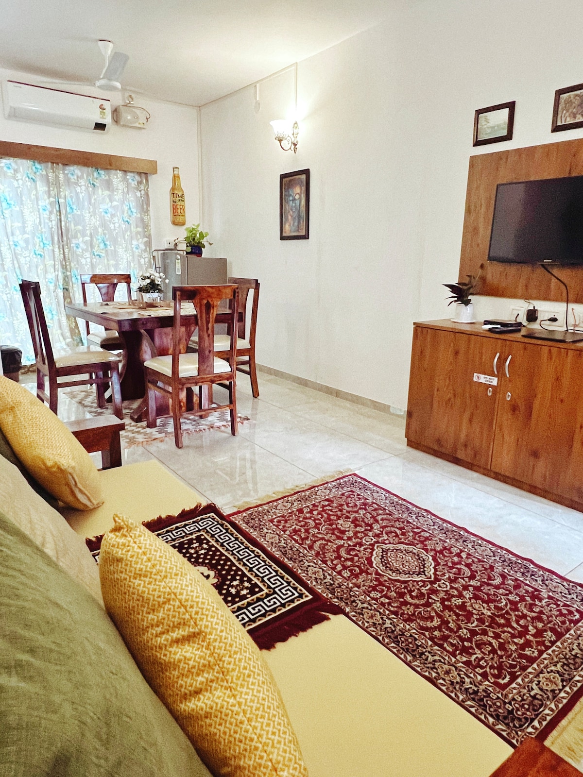 Este es un apartotel que tiene 24 apartamentos con piscina, comedor común y área de juegos enclavada en greens. Tu apartamento es de aprox. 720 pies cuadrados. Dormitorio separado, sala de estar, cocina, sofá cama, baño, artículos de tocador, 2 balcones. El color de los muebles e interiores puede variar según la disponibilidad. Estamos ubicados a 5/10 minutos en bicicleta o en coche de las hermosas playas de Majorda, Betalbatim, Colva, Utorda y los mejores restaurantes como Martins Corner, Pentagon, Cota Cozinha, Juju, Folga, Jamming Goat.