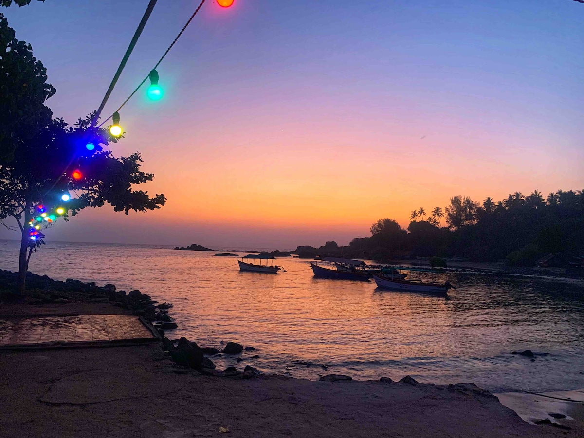 Ubicada en las orillas del río Talpona, esta lujosa villa ofrece un asiento en primera fila para la impresionante naturaleza. Despierta con el canto de los pájaros, bebe un café por la mañana en tu terraza privada junto al río y deja que la tranquilidad te rodee. A pocos minutos de Patnem Beach (4 min) y Palolem Beach (6 min), combina un refugio aislado con un vibrante acceso a la playa. Disfruta de limpieza diario, comodidad premium y serenidad. ★ “Impecable, cuidadosamente diseñado e increíblemente cómodo. ¡Nuestra estadía favorita en Airbnb hasta ahora!”