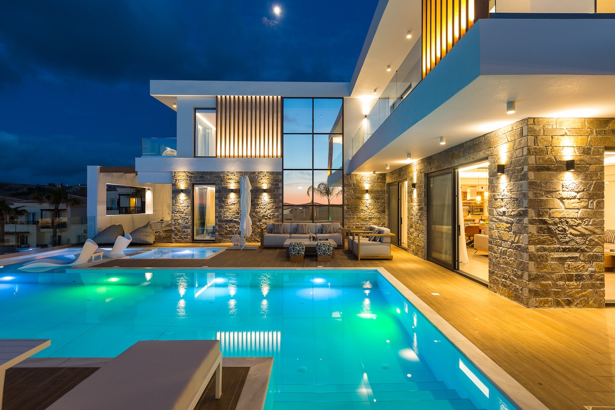 A Modern Luxury Escape in Panormos, Rethymno Just 400m from the sandy beach, Selestine Villa is a 500m² contemporary retreat on a private estate, offering 2 pools, a private elevator and panoramic sea views. With 6 elegant bedrooms for up to 13 guests (14 upon request), spacious indoor/outdoor areas and quick access to Panormos’ tavernas and harbor, it delivers a stylish, serene Cretan escape.