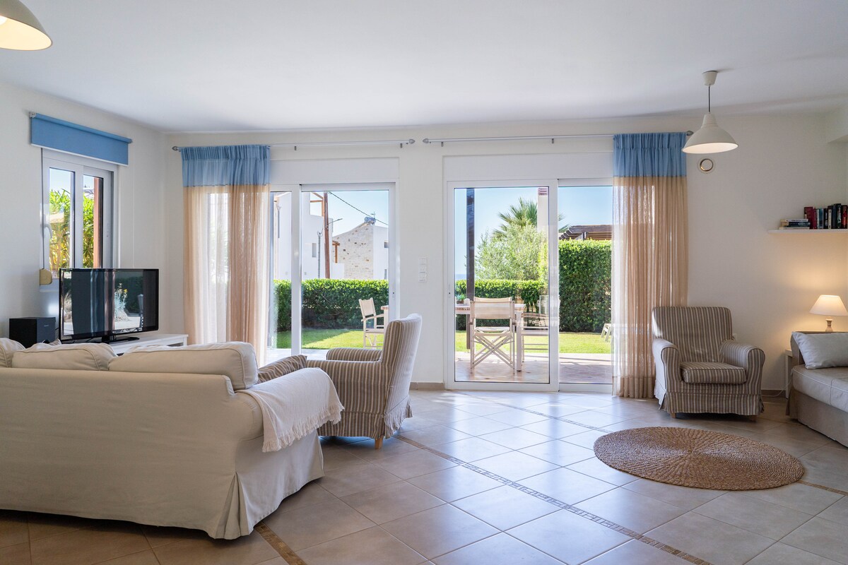 y un lugar dominado por el cielo azul, la gran línea costera y el paisaje tradicional de cretán, surge la lujosa Villa Blanca. ¡Esta villa de 170 metros cuadrados con capacidad para 8 personas está a solo 100 metros de la playa y tiene vistas al mar! Es la opción ideal para aquellos que quieren explorar Creta de una manera lujosa o para los perezosos que simplemente se relajarían, disfrutarían del mar o de la piscina privada y el sol, sin pasar absolutamente nada.