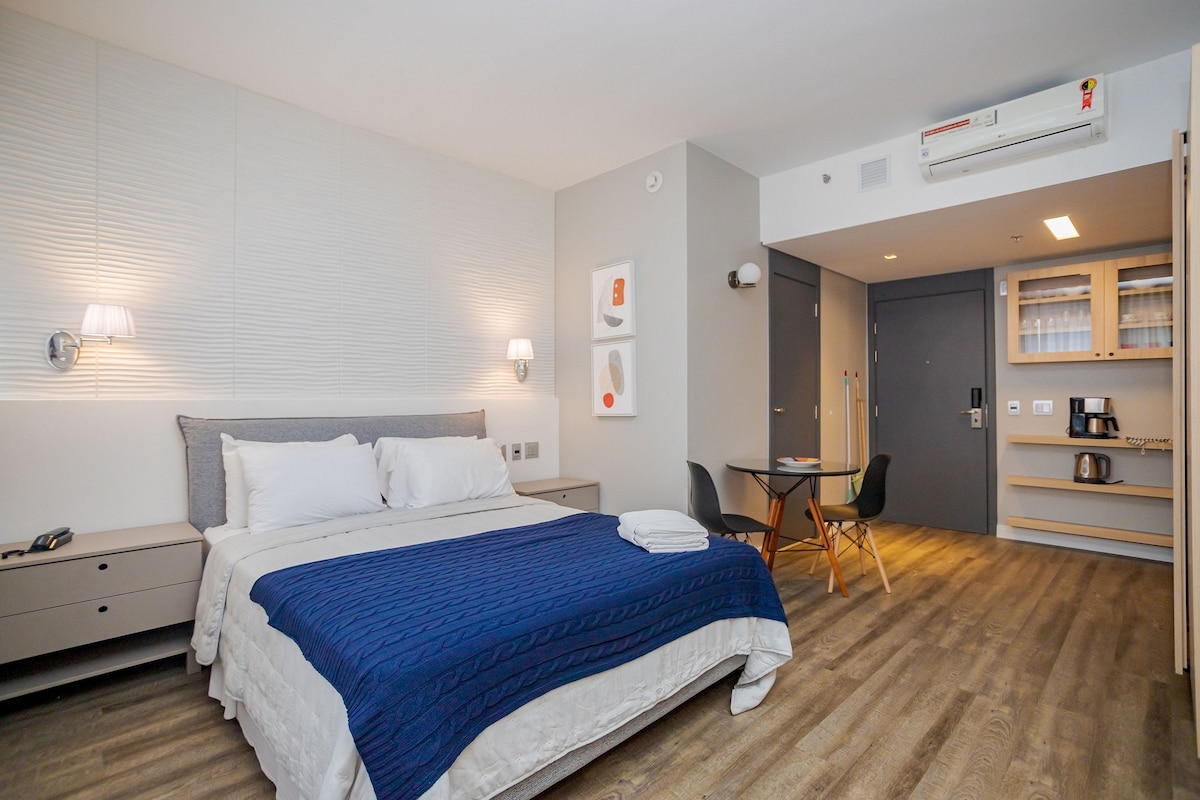 Estudio moderno, nuevo, acogedor, ubicación perfecta, con una hermosa vista desde el balcón, especialmente por la noche. Wifi rápido, escritorio, TV inteligente de 55”, cama Queen. Aire acondicionado (frío/calor). Lavadora y secadora y una hermosa isla en la cocina. 50m2 de mucho estilo-27ºandar, Silencioso. En el Centro/Batel, cerca de comercios, bancos, centros comerciales, polo gastronómico y Hospital. En el edificio: piscina, gimnasio, sala de juegos, sauna, jacuzzi, conserjería las 24 horas.