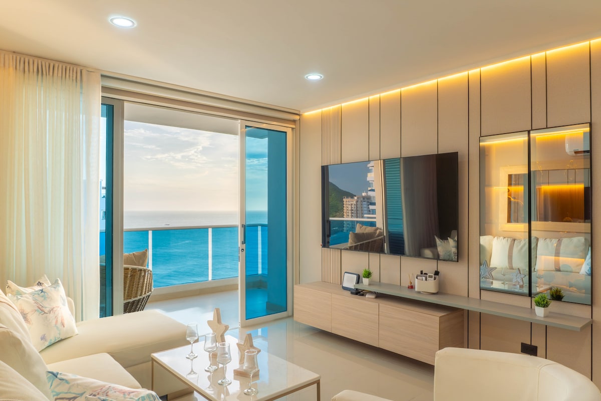 Espectacular apartamento moderno para estrenar en un piso 17 con vista al mar y salida directa a la playa. Espacio agradable para tomar vacaciones, descansar y/o trabajar home office. A 10 minutos del aeropuerto internacional y del centro histórico de Santa Marta, cerca a zona de restaurantes, bares, centros comerciales y farmacias. A menos de una hora del Parque Nacional Tayrona, Taganga, Minca. El apartamento cuenta con un amplio balcón donde podrás disfrutar del mejor atardecer de Colombia.