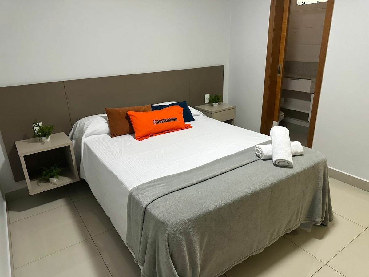 Nuevo condominio ❗️Un apartamento único, elegante y sofisticado, hecho para hacerte sentir en casa. Mira tu película favorita en el dormitorio o en la sala de estar con TV giratoria con canales abiertos y aire acondicionado en la habitación. ¡Descansa en una cama tamaño queen y disfruta de la vista desde el amplio balcón del jardín y de una hermosa puesta de sol en el contemporáneo Setor Bueno en la mejor región de Goiânia! Condomínio Tai Residências