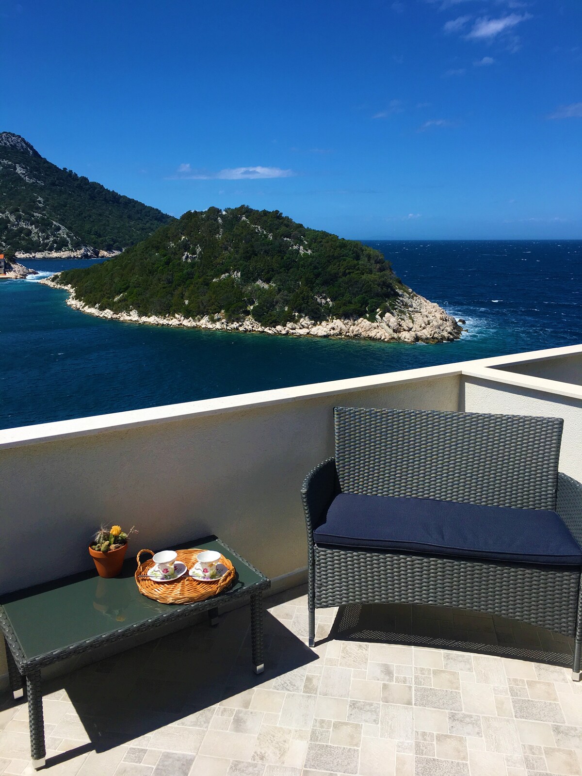 Alquilé la parte más hermosa de mi casa con una terraza romántica con vistas a la vista. Mis huéspedes tienden a tumbarse en un sofá después de cenar,degustar el vino de Corcula y disfrutar de la hermosa vista,acariciada por la brisa marina al atardecer. El apartamento es amplio y moderno, con la playa a solo 10 metros de distancia. Wifi gratuito y estacionamiento gratuito frente a la casa.