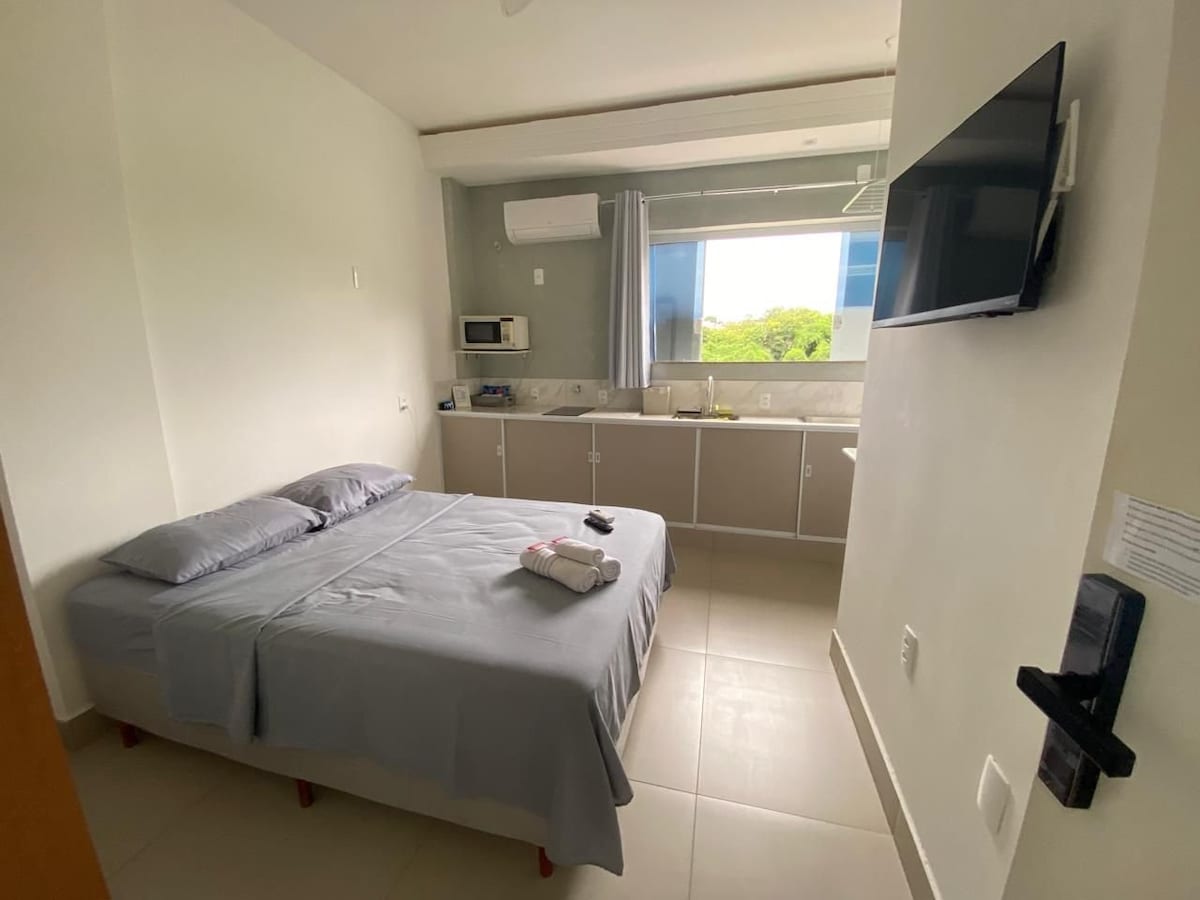 Acogedor Stúdio, nuevo, espacioso, te espera. - Suite - Aire acondicionado - Televisor - Cocina con microondas, minibar, cafetería con cápsulas, sandwichera, platos, cubiertos, tazas y vasos. - Ropa de cama y baño, jabón líquido, champú y acondicionador. - 01 plaza de aparcamiento - Cerca de dos hipermercados, UEMG, farmacias, foro, estación de autobuses, gasolineras, restaurantes, bares, cerca del centro. Excelente ubicación. puertas: la puerta electrónica proporcionará más seguridad y comodidades.