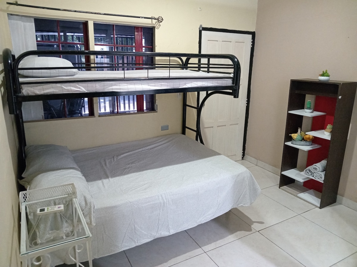 Disfruta de este alojamiento con entrada independiente. Con todo lo necesario para una estadía cómoda y placentera, en un lugar céntrico en la ciudad de David. Posee patio cercado y tiene espacio para estacionar un auto dentro del patio. A 4 min del aeropuerto, 2 min del super Xtra, 5 min de la feria de David, y 7 min del centro de la ciudad. Además a 45 min podrá degustar tanto de un exquisito café y clima fresco en Boquete como de un delicioso pescado frito en playa la Barqueta.