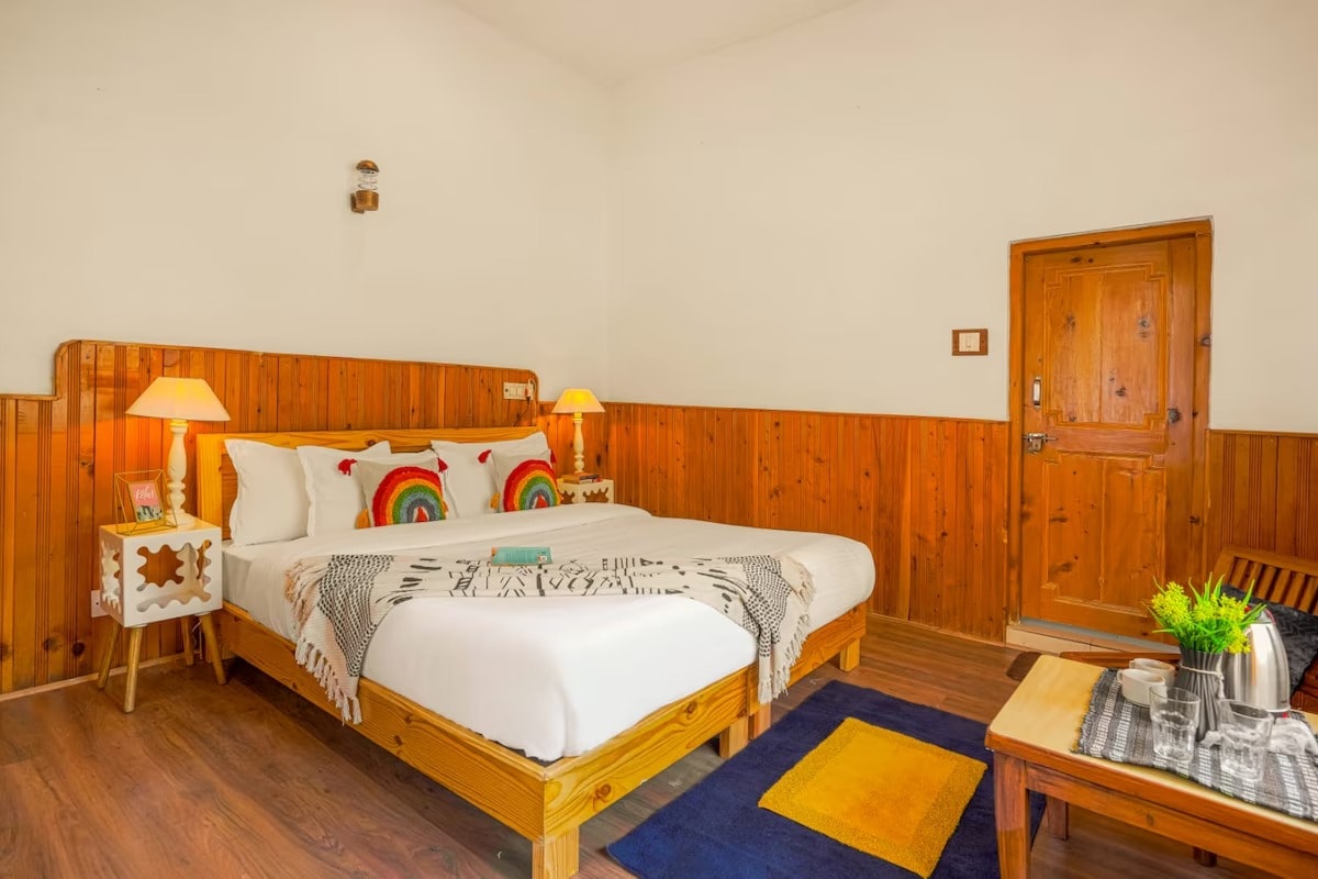 The Family Suite at Ayesha’s Fairytale Cottage in Tirthan Valley, Himachal Pradesh, is a cozy retreat for families. It features a spacious living area with a double bed and an indoor fireplace, perfect for chilly evenings. A charming wooden attic upstairs offers another double bed and a fun children’s play area. Enjoy scenic views from the private balcony and savor local dishes at the in-house café and restaurant. Nestled in Banjar, Kullu, it’s a serene escape for nature and comfort lovers.