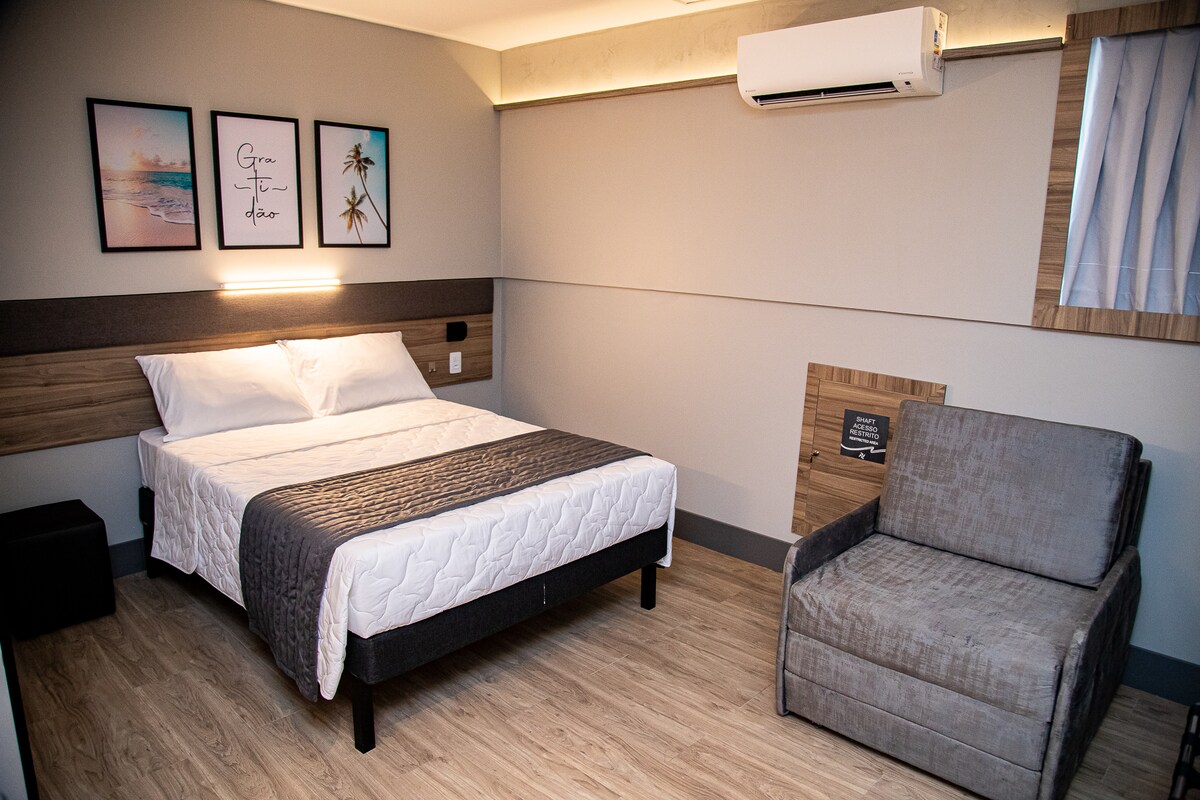 Quarto casal número 113 - Café da manhã incluso no valor da diária. O Hotel fica a 300 metros da Orla; próximo a unidades de ensino (Universidade de Pernambuco, Uninassau, Faculdade de Administração- Facape, Colégio GGE); a bons restaurantes e a 15 minutos (de carro) do River Shopping e Bodódromo.
