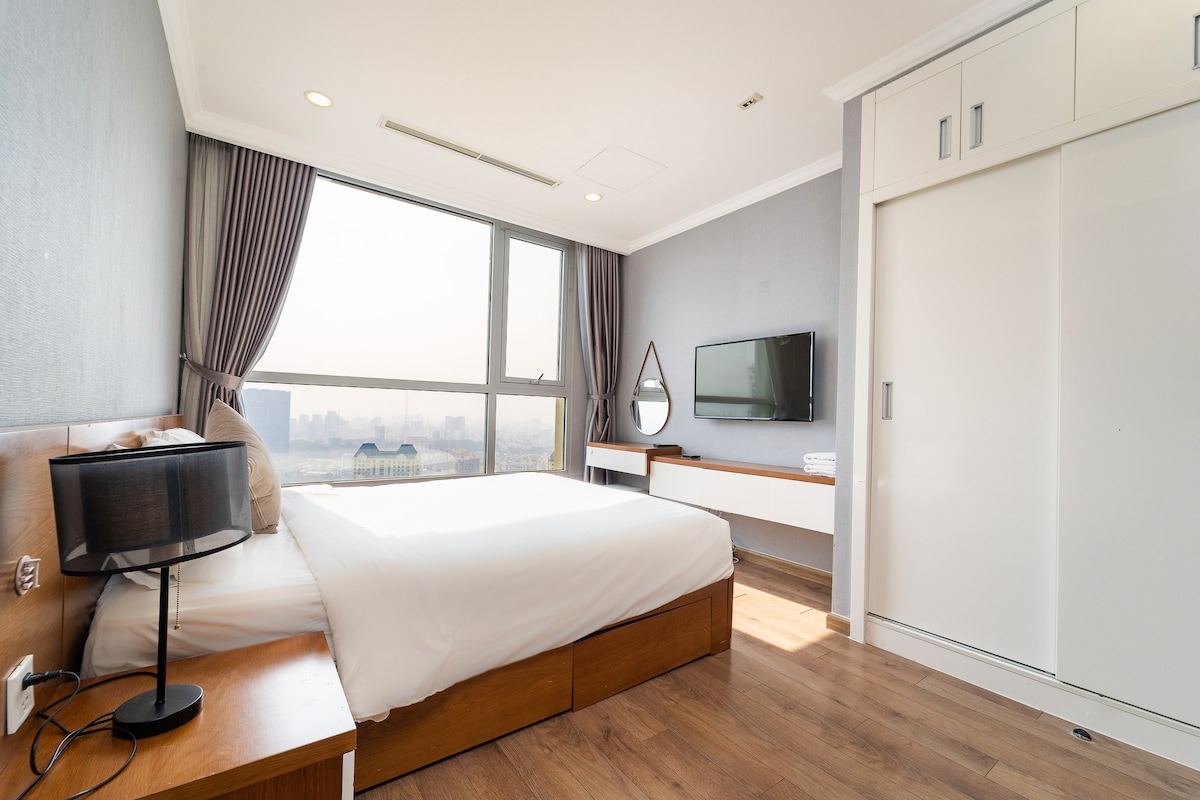 Diseño moderno, más cómodo, gran balcón con vistas abiertas, tranquilo a la calle y al río 2 dormitorios, 2 camas tamaño queen, sala de reuniones 2 baños grandes. Lavadora gratuita, WiFi, cable de TV internacional, estufa, horno, área de barbacoa Instalaciones internas y contiguas: piscina, gimnasio, barbacoa, Vincom Megal Mall, supermercado Vinmart, parques y áreas de juegos infantiles, restaurantes, Mega Market, cines, hospitales ...cerca del bar, punto de referencia 81. El departamento en la zona central está cerca