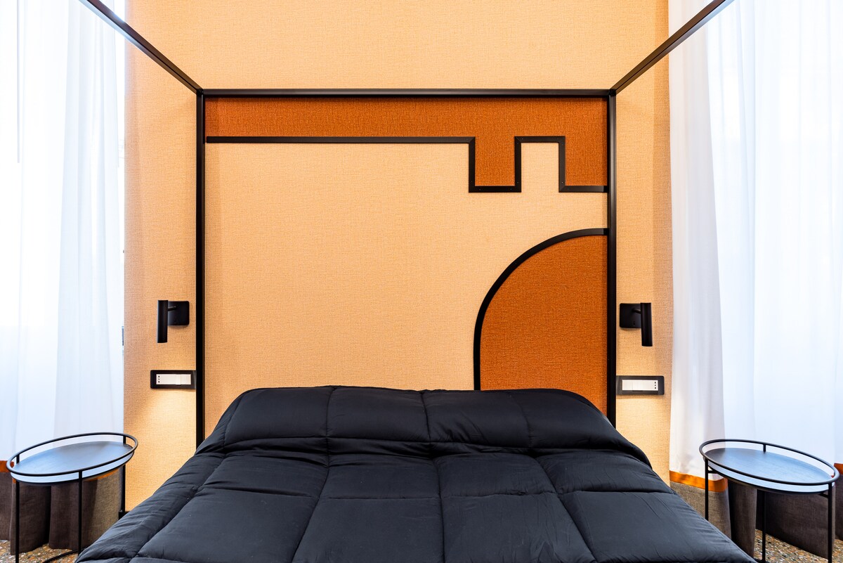 Decoro at Montecalvario 34 A bright, modern room featuring an orange design structure that gives energy and personality to the room. Clean lines, bold colors and essential comfort for a stylish stay in the center of Naples. The room has a double bed, private bathroom, air conditioning, fast Wi-Fi and flat-screen TV. Ideal for those who love curated spaces and are looking for a comfortable and creative base for exploring the city.