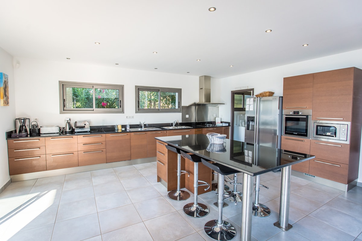 Villa nueva totalmente equipada, situada dentro de una propiedad arbolada y segura. Alojamiento espacioso (120 m2). La terraza de madera ofrece impresionantes vistas del golfo de Ajaccio, la playa de Agosta y las Islas Sanguinarias y le permite acceder directamente a la piscina climatizada. Cerca de todas las tiendas, playas, base náutica y GIGA GOLF. A 15 minutos del aeropuerto, a 30 minutos del puerto y del centro de la ciudad de Ajaccio. Abierto a los pueblos del interior de Córcega. Perfecto para recibir a una familia.
