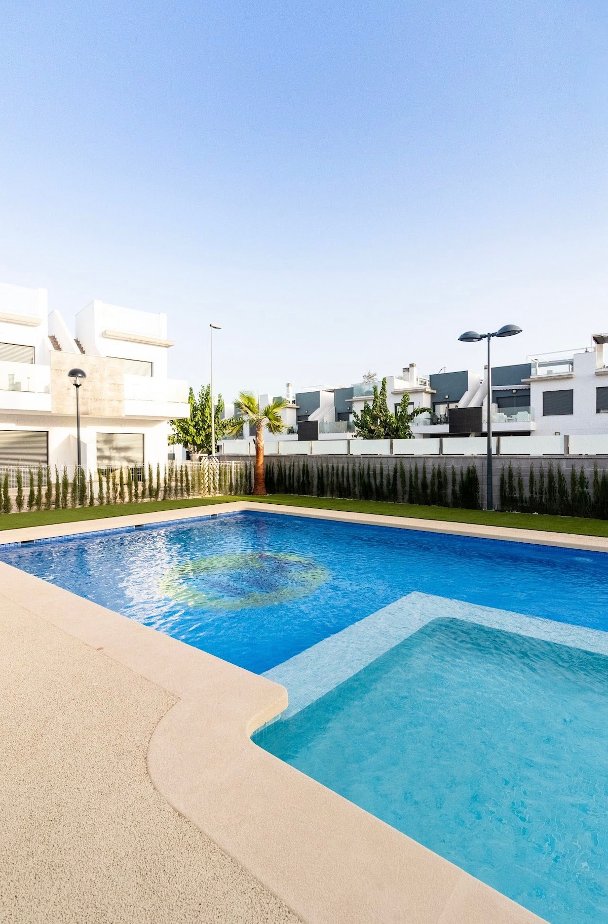 Zupełnie nowy, idealnie zlokalizowany nowoczesny, w pełni wyposażony apartament, z prywatnym basenem, 2 tarasami zapewniającymi komfortowy wypoczynek w spokojnym otoczeniu, tuż przy pięknym palmowym parku, 3 kilometry do plaż, 600 metrów do centrum, 3 km. do pól golfowych, Idealnie skomunikowany z pobliskimi lotniskami w Alicante (55 km), Murcii (40km), 5 km do centrum handlowego i wielu innych udogodnień dookoła .