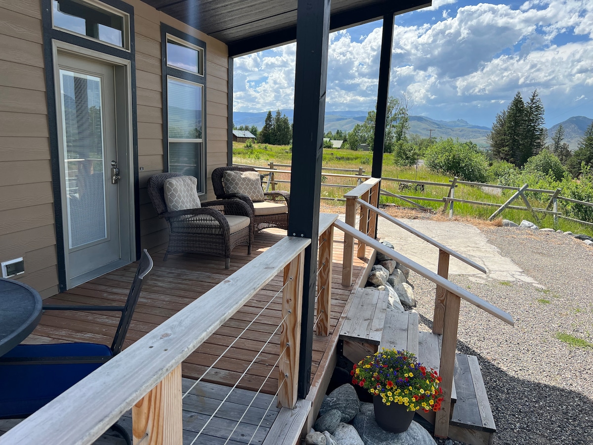 Tendrás tu propia entrada independiente a esta encantadora y cómoda suite de invitados en el nivel inferior de una casa de troncos de 3 pisos. La casa se encuentra a pocas millas al norte de Bozeman, en un barrio tranquilo y cuenta con vistas increíbles a las montañas Bridger. El espacio fue completamente renovado durante el verano de 2022 para ser un refugio súper cómodo y tranquilo para dos. Vivo en el nivel superior de la casa, por lo que oirás sonidos ocasionales míos y de mi mezcla de Schnauzer de 15 libras, Dill.