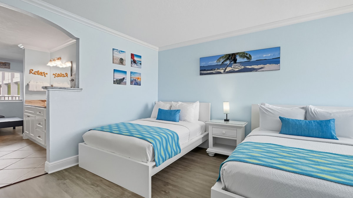 Suite King en Las Olas – Comodidad moderna a pasos de la arena Toma el sol y relájate en Las Olas of Treasure Island, una escapada costera boutique justo enfrente de las aguas cristalinas de Treasure Island Beach. Una joya de 12 habitaciones limpias y cómodas diseñadas para los amantes de la playa. Esta suite King tiene capacidad para 4 personas con un sofá cama Queen, cocina y todos los elementos esenciales para que te sientas como en casa. Comodidades modernas con encanto junto a la playa Las Olas ~ ¡déjate guiar por las olas!