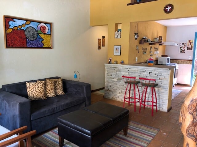 Estás en casa, disfruta de la tranquilidad y las bellezas naturales e históricas de esta maravillosa ciudad que es Pirenópolis. A 2 km de la iglesia de Rosário (6 minutos en coche) situada en un barrio residencial muy tranquilo y seguro, Park Jardim Brasília. 3 dormitorios, una suite con una cama doble, un segundo dormitorio con una cama doble y el tercero con una cama doble (2 camas individuales), todos con una mesa de oficina en casa y wifi. En el salón también hay un sofá cama doble, y podemos proporcionar una cuna portátil con un colchón.