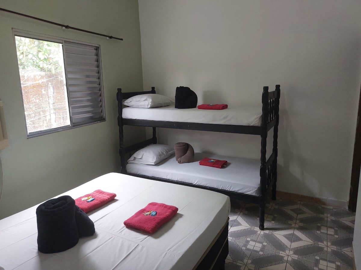 Habitación privada en Guarujá para una pareja y 2 personas más. Edificio sin ascensor. Cerradura electrónica con contraseña en la puerta del apartamento. ¡PRECIO POR PERSONA! El desayuno se cobra por separado. Se proporcionarán toallas y sábanas, jabón y papel higiénico. Tendrás que subir escaleras para acceder al baño. El baño se comparte con la anfitriona y su familia. Ventilador en todas las habitaciones. Tenemos un perro como mascota. No cambio la fecha de viaje debido al mal tiempo. El wifi del edificio puede fallar ocasionalmente