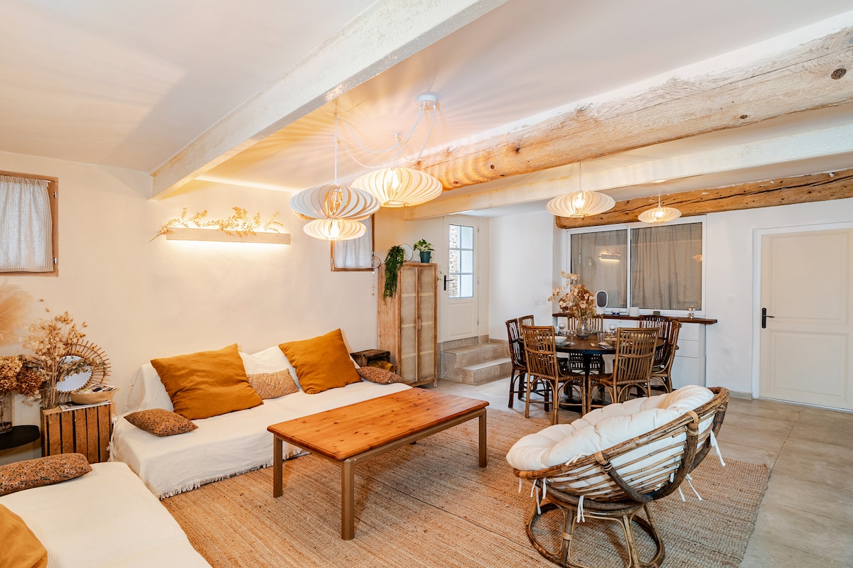 Si busca autenticidad, tranquilidad y naturaleza, Tuchan es el lugar ideal para sus vacaciones. A 1 hora de Narbona, a 45 minutos de Perpiñán, a 1 hora de España, a 30 minutos del mar, toma una pequeña carretera sinuosa llena de encanto a través de los viñedos, los pinos y la garriga Tuchan es un pequeño pueblo con encanto con todas las comodidades ( panadería ,tienda de comestibles ,farmacia ,médico)restaurante El alojamiento es una antigua herrería acondicionada Si le gusta la tranquilidad, pronto se sentirá cómodo aquí .