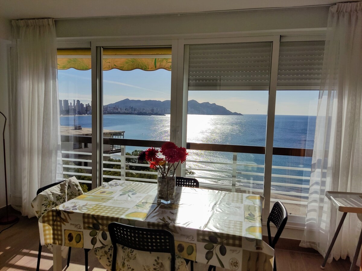 Beachfront apartment, lift facilities, ideally located, next to Benidorm, first line of a beautiful sandy beach, in a quiet area.Private terrace (as you were on a Cruise), share pool, community parking ( .Near restaurants, bars, shops, pharmacy, banks and so on. Full equipated. Wifi , Air conditioner, parabollic tv. Glanced terrace. Every facilities you would expect in a small town are really near, including shops, bars, restaurants, supermarkets, with internet and so on ( 1,2,3 minutes walk).