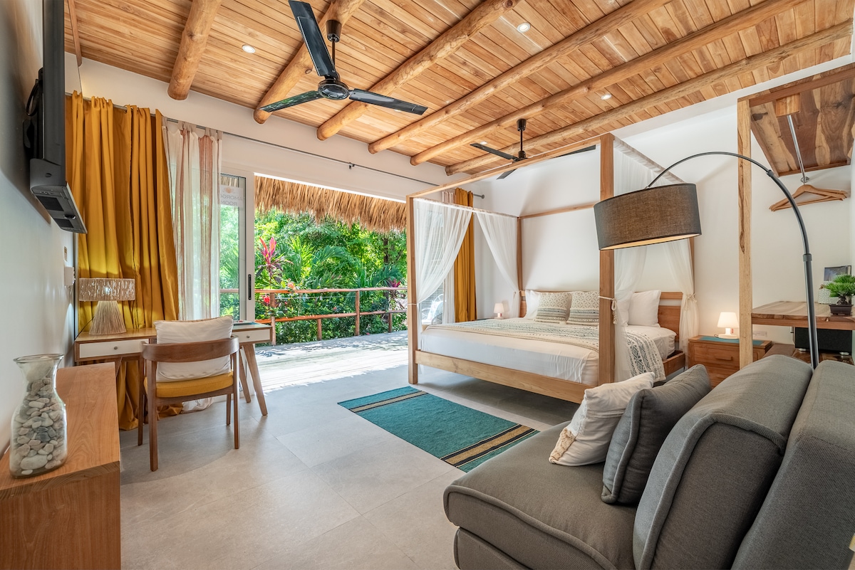 Desde esta ubicación en la cima de la colina sobre la bahía de Tamarindo, disfrutarás de una vista panorámica que es increíble. ¡Verás a qué nos referimos cuando llegues! ¡La Casita ofrece una cama tamaño king y una cama tamaño queen desplegable, totalmente equipada con baño privado, cocina y un pequeño balcón perfecto para ver monos en los árboles circundantes! ¡También tendrás acceso al espacio social de la propiedad, incluida una terraza cubierta con brisa junto a la piscina con vistas al mar y el salón en la azotea!