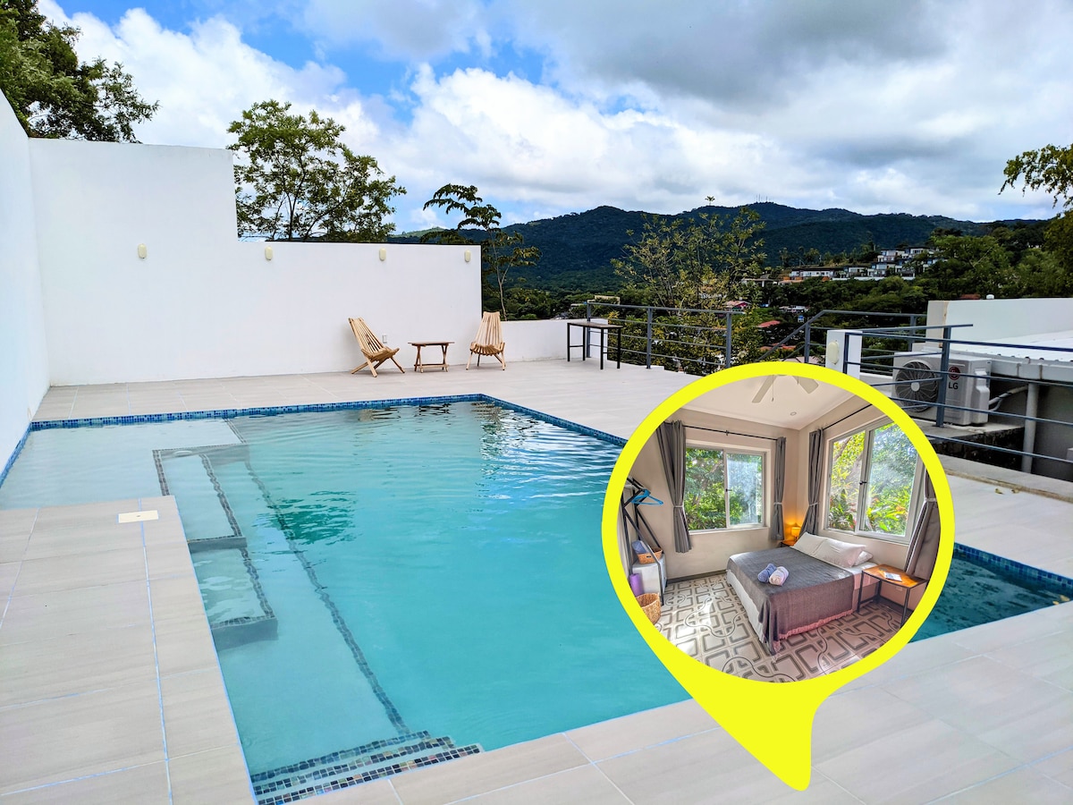 Chic, stylish studio located just steps from town and the beach! Condito Mapache is a new space located just on the edge of the town of San Juan del Sur. Decorated in handcrafted Nicaraguan furniture, and hand painted tiles from Granada, this spacious studio offers you everything you need to be comfortable on your stay in Nicaragua. Wifi, AC, smart TV, Juliette balcony, shared pool, stocked kitchen, washer/dryer and onsite pizza parlour are just some of the perks of this sweet little space!