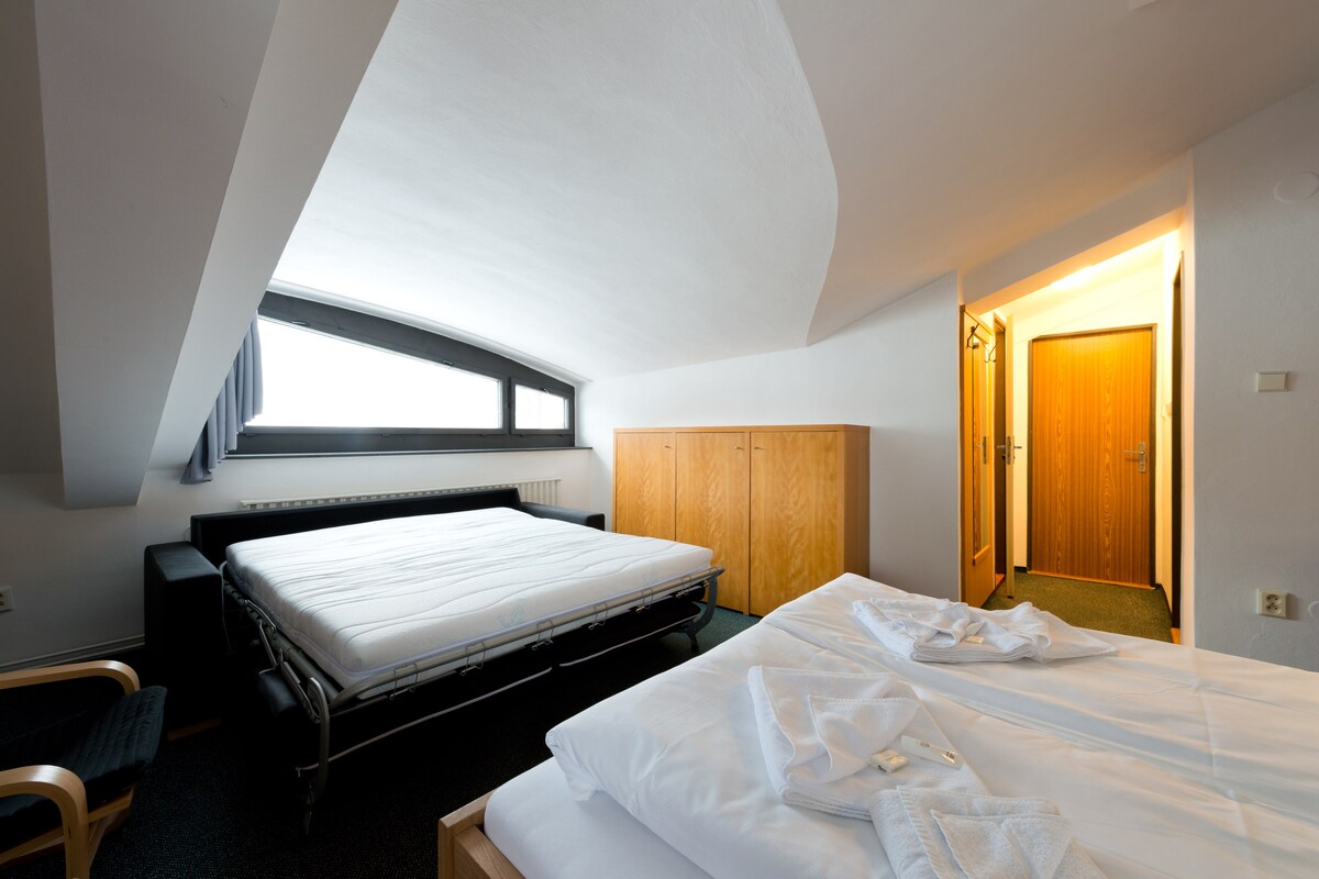 La habitación triple con una cama doble y un baño privado con bañera está equipada en un estándar de 3*+ y ofrece acceso a Internet y TV con 20 programas.