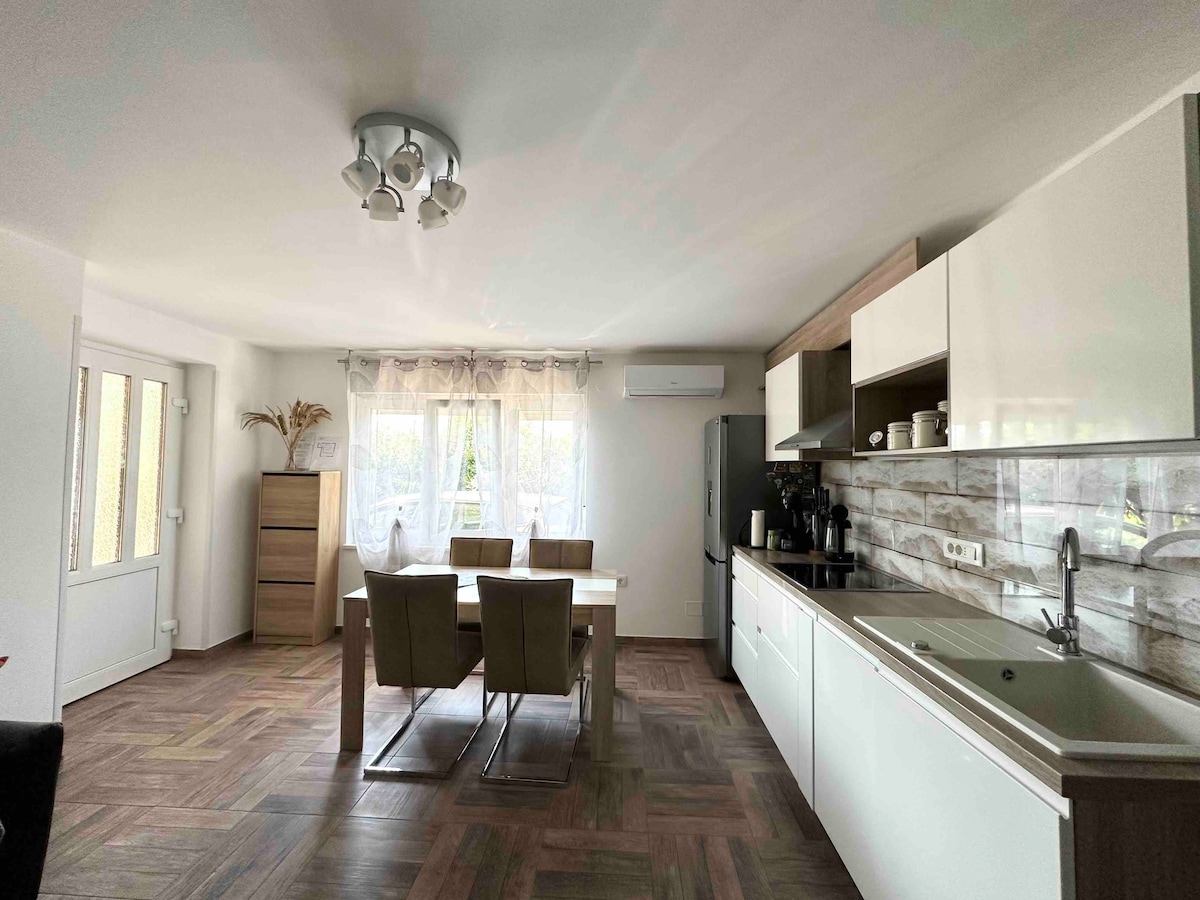 El apartamento está situado cerca del centro de la ciudad de Opatija, a solo unos minutos en coche o a ocho minutos a pie. Consta de una sala de estar, dormitorio, un comedor, dos baños, cocina, sauna, salón de espacio abierto, terraza, un jardín circundante y un estacionamiento. Gracias al hecho de estar en la planta baja con un jardín circundante, tienes la sensación de alquilar una casa y no un apartamento.
