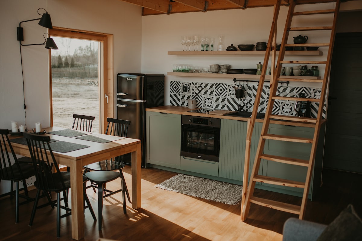 Nuestra casa de madera ha sido diseñada de forma moderna y funcional. Hemos intentado integrarnos perfectamente en el entorno y no perturbar la naturaleza que nos rodea por todos lados. Nuestro pequeño pueblo no se ha rendido al tiempo, todo funciona aquí como antes. No hay tiendas ni restaurantes, no hay turistas, solo silencio y naturaleza. El pueblo está rodeado de prados y el bosque de Puszcza Piska, a 10 km de las localidades más cercanas. Las grullas y las innumerables aves acuáticas te invitan a un espectáculo diario. Aquí encontrarás la paz.