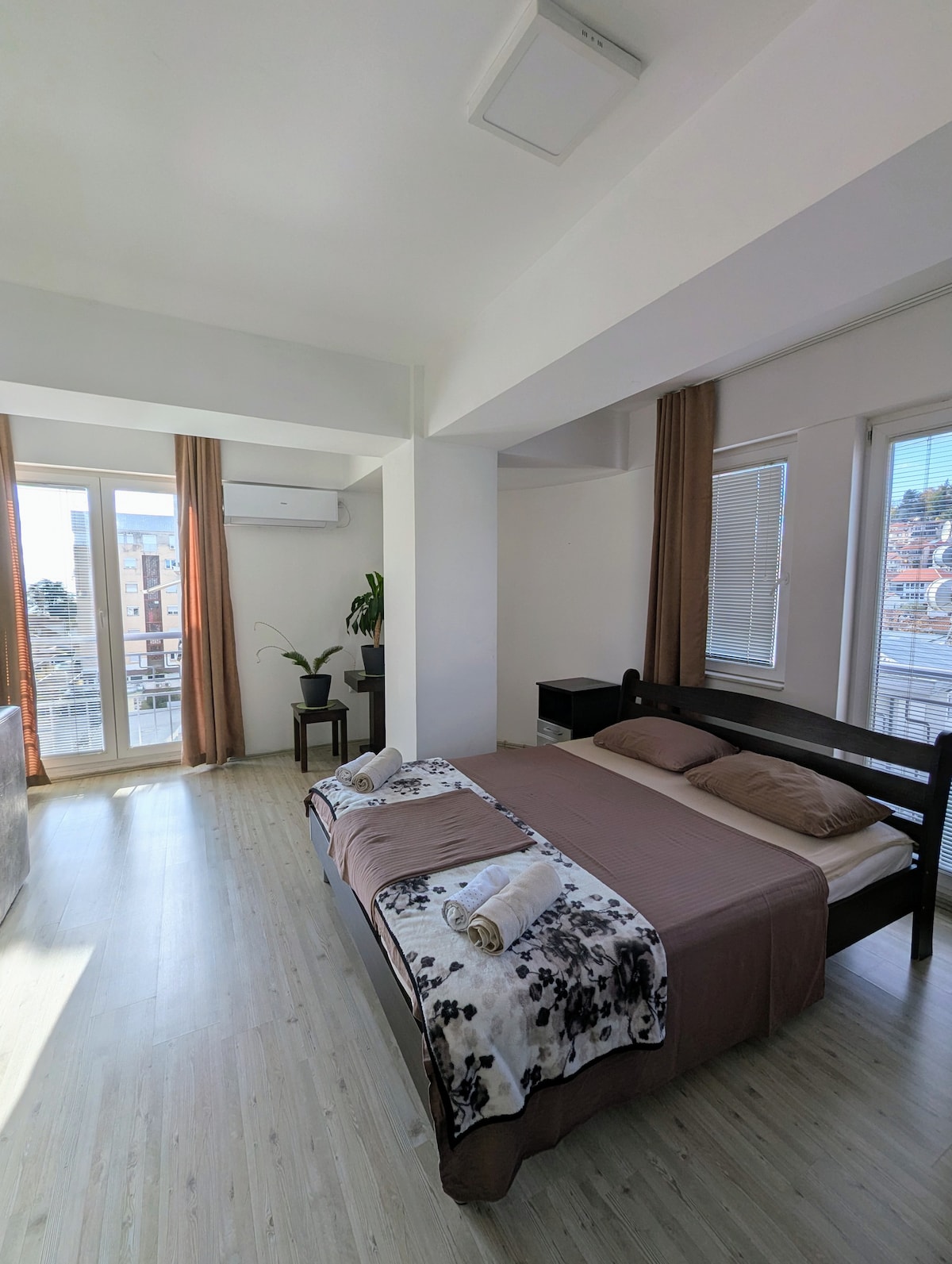Un elegante apartamento de dos dormitorios, un baño y un aseo con fácil acceso a todo desde este lugar céntrico a menos de 5 minutos a pie de la plaza central del casco antiguo. Disfruta sentado en el patio con una vista maravillosa del lago Ohrid y la catedral de Santa Sofía. El apartamento ofrece aparcamiento gratuito, una amplia sala de estar, una cocina moderna, aire acondicionado central, TV inteligente, etc.