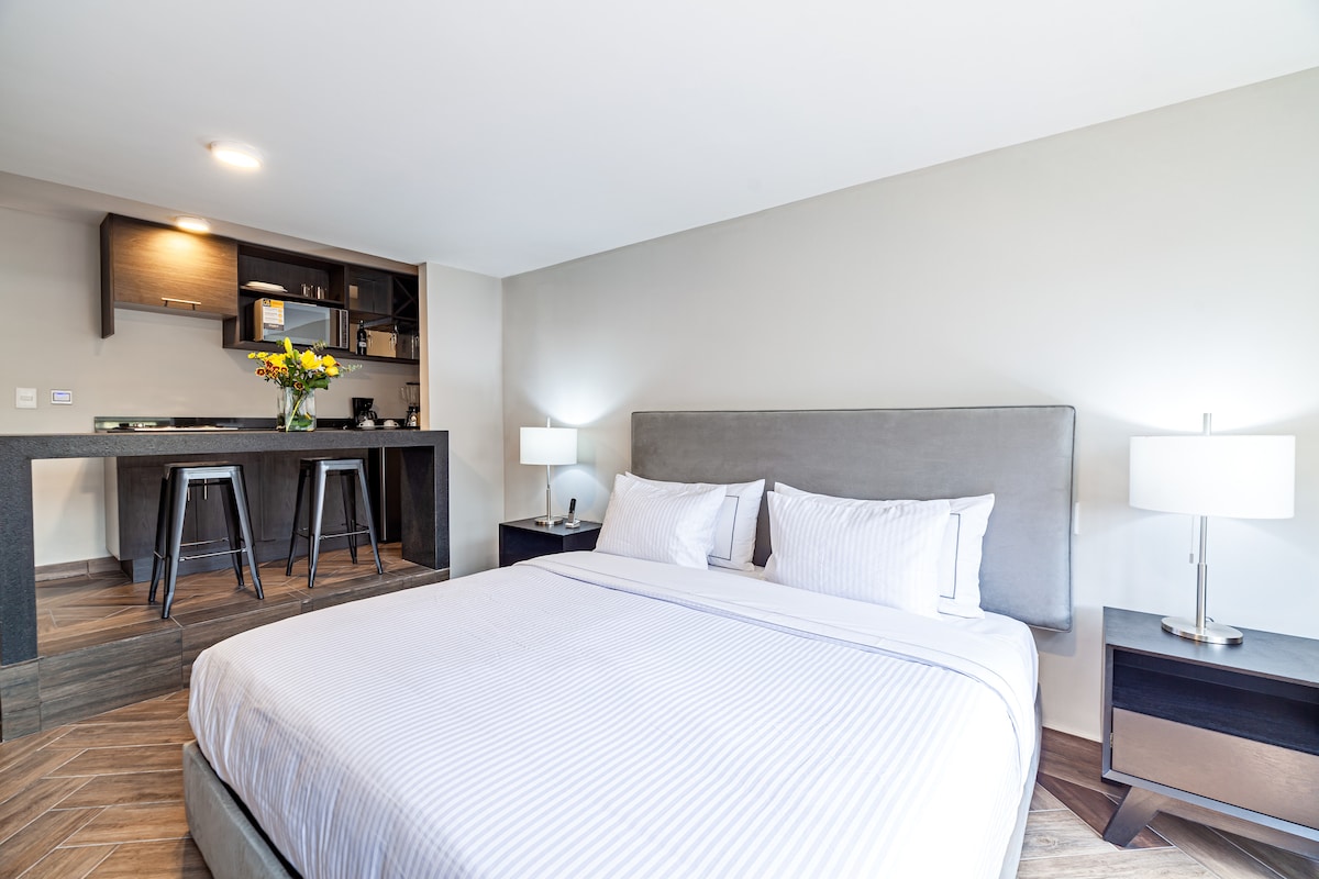Hermosa suite recién remodelada, ideal para dos personas, contamos con una Cama Queen, una gran Smart TV, contamos con conexión WIFI de alta velocidad con fibra óptica. Tenemos persianas tipo black out y sun shades para que puedas tener un gran alto grado de privacidad y descanso en tu estancia, nuestra cabecera es un closet ideal para almacenar maletas y ropa.