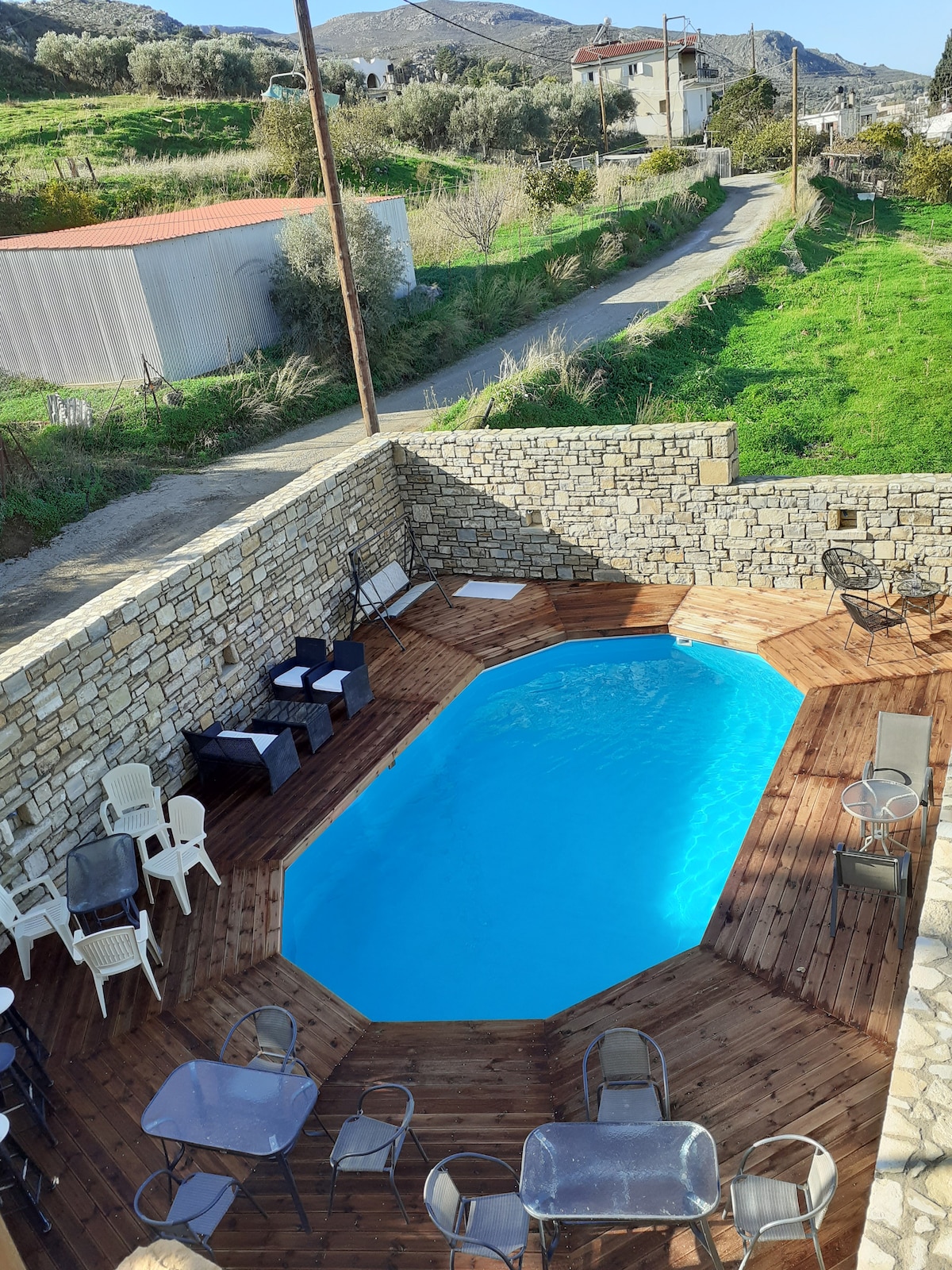 Kazantzakis House est une maison typique des îles grecques, par sa forme et ses couleurs. Cette maison neuve de 40 m2 est entourée de grands espaces extérieurs, avec chaises longues et table pour manger aussi dehors, sous la pergola ombragée de 18 mètres carrés ou dans le jardin privatif où vous pouvez savourer les fruits de saison : mandarines, oranges, citrons, grenades... Un barbecue est aussi à votre disposition, ainsi que des plantes aromatiques et quelques surprises pour vos repas.