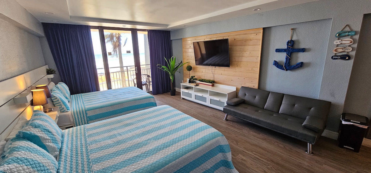 ¡Bienvenido a Lala's Beach House, donde puedes cruzar la calle hasta la playa! Esta espaciosa unidad cuenta con una cama tamaño king, una sala de estar y una cocina pequeña. La habitación flexible incluye una cama de tamaño completo, ideal para familias o grupos pequeños. El baño extragrande cuenta con una ducha a ras de suelo y una encantadora bañera con patas. Relájate en el balcón, perfecto para disfrutar de la refrescante brisa marina. A poca distancia a pie de la famosa Flagler Avenue, con tiendas, restaurantes y entretenimiento.