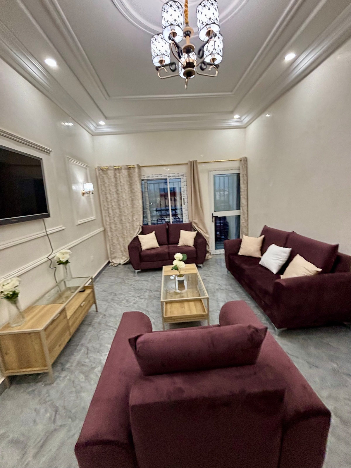 • Impresionante departamento totalmente amueblado, dentro de dos dormitorios, una sala de estar, una cocina pequeña, un baño y baños modernos. • Tiene una gran pantalla QLED de 55pulgadas con Netflix y conexión WiFi. • Un guardia diurno y nocturno, un servicio de limpieza las 24 horas, los 7 días de la semana, protegido por un sistema de alarma y una valla eléctrica, así como cámaras CCTV. • Un generador electrónico en caso de apagón, un lote de agua y un estacionamiento privado.