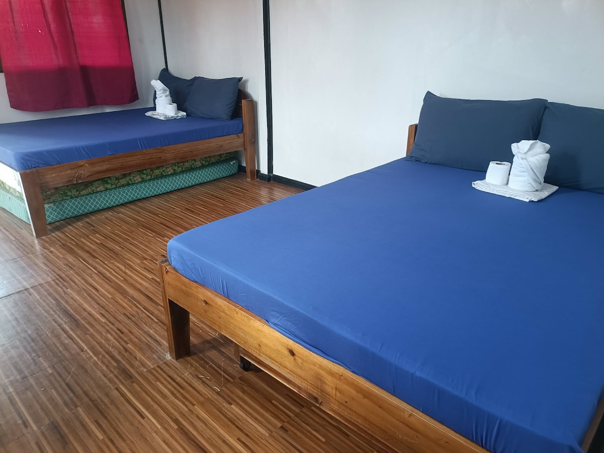 This room includes 4 beds, aircondition and fan supported, with mini kitchen inside, and also private bathroom with hot and cold shower.
