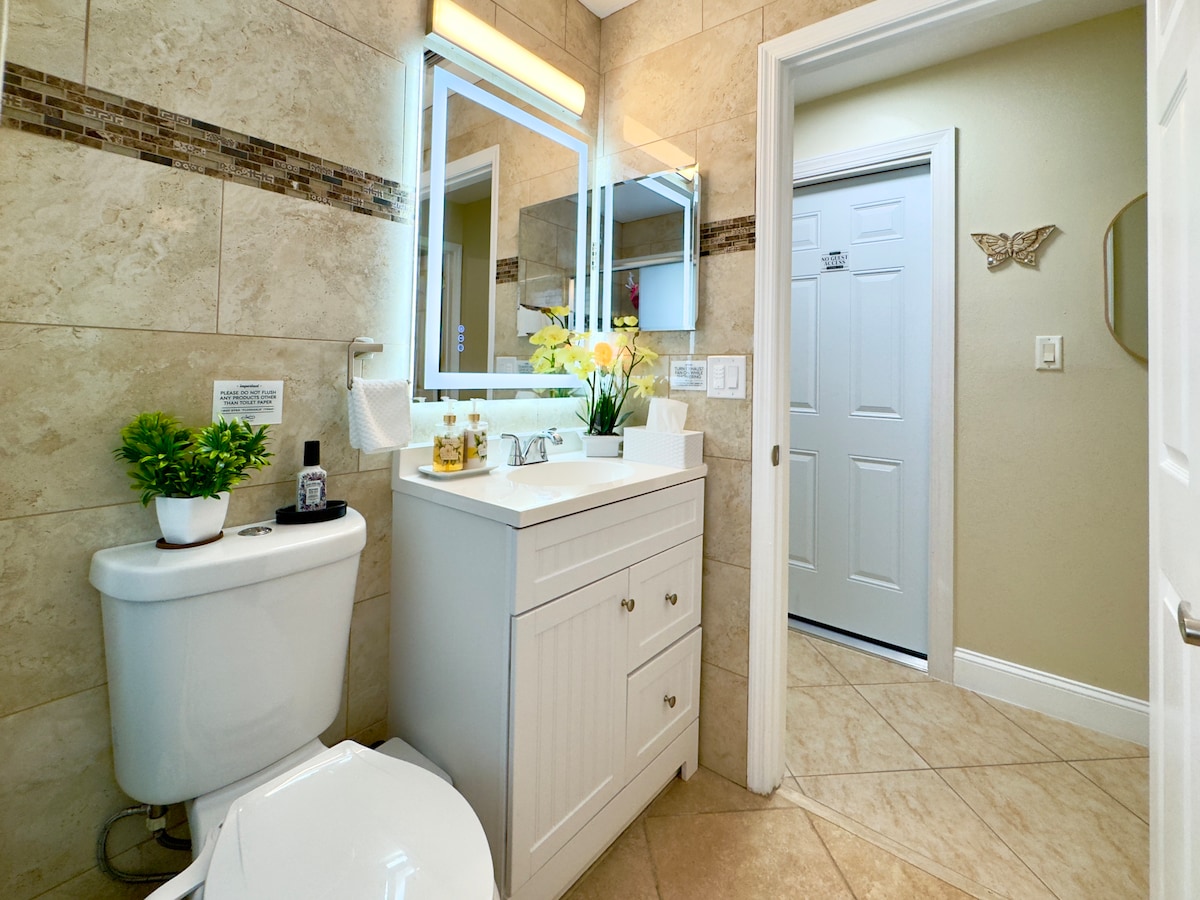 ¡La casa tiene 1600 pies cuadrados y tu espacio es de 335 pies cuadrados, privado y acogedor! Cuenta con un dormitorio, sala de estar y un baño completo. El aparcamiento está bajo la cochera para esos días de lluvia tropical (estaciona en el lado derecho), es un espacio compartido. Hay dos televisores inteligentes que tienen Netflix, Tubi, YouTube y otros. La cocina pequeña tiene una cafetera Keurig, nevera de tamaño compacto y microondas. Tenemos sillas de playa/toallas, ducha exterior, agua fría y caliente. * ¡Hay gatos en la propiedad! * Perra llamada Lucy. * Mayores de 21 años.