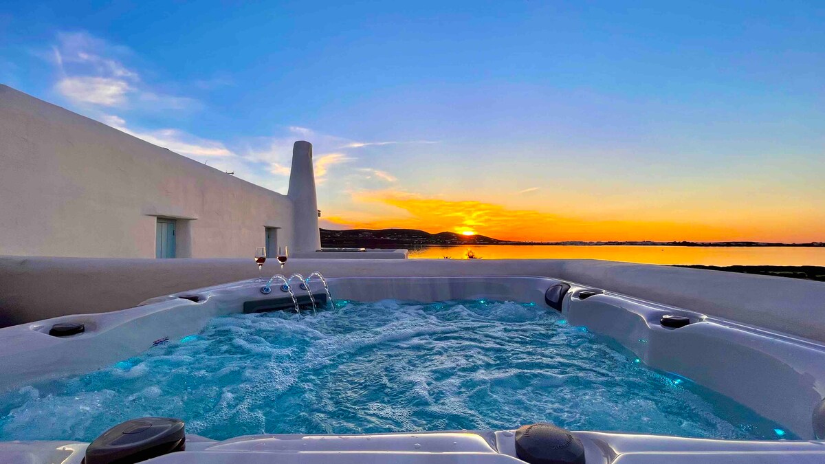 Sueno sunset villa for 2 is located in a nice area which combines beautiful sea-views,it is part of a complex consisting of 5 other apartments,It is 2,3 kilometers from the port of Parikia .The old town, the shops and the night life are 1200 meters away. It is 33 square meters and has a fully equipped kitchen, 1 bedroom, a living room, 1bathroom and veranda with jacuzzi is not heated. You deliver it clean with sheets and towels and there is not a service include during your stay.